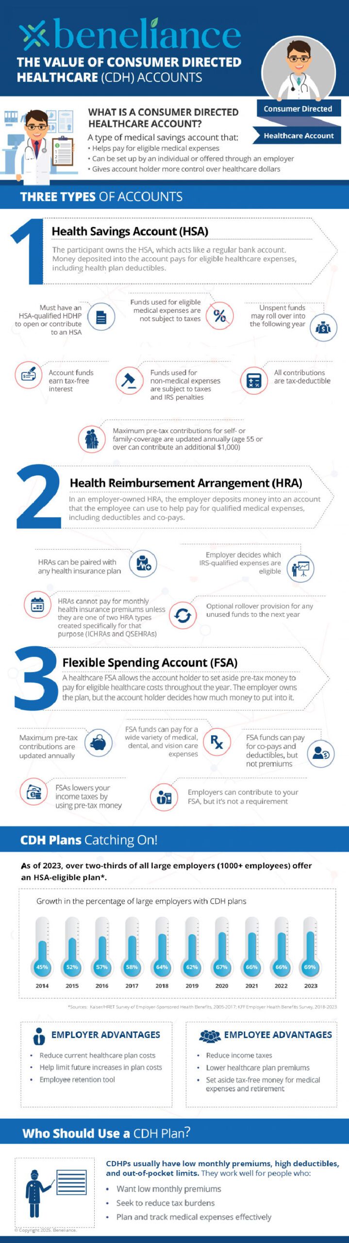 The infographic below details the value of consumer-directed healthcare accounts. Learn more from this overview of HSAs, HRAs, FSAs, and other helpful information.
